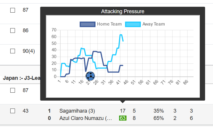 SoccerScanner’s Attacking Pressure graphs are unique visual tools that track a team’s offensive momentum over the last 10 minutes of play. When attacking pressure is high, the figures are shaded in green, making it easy to spot shifts in dominance. The two graphs use different statistics related to attacking intent, which is why they give you different values